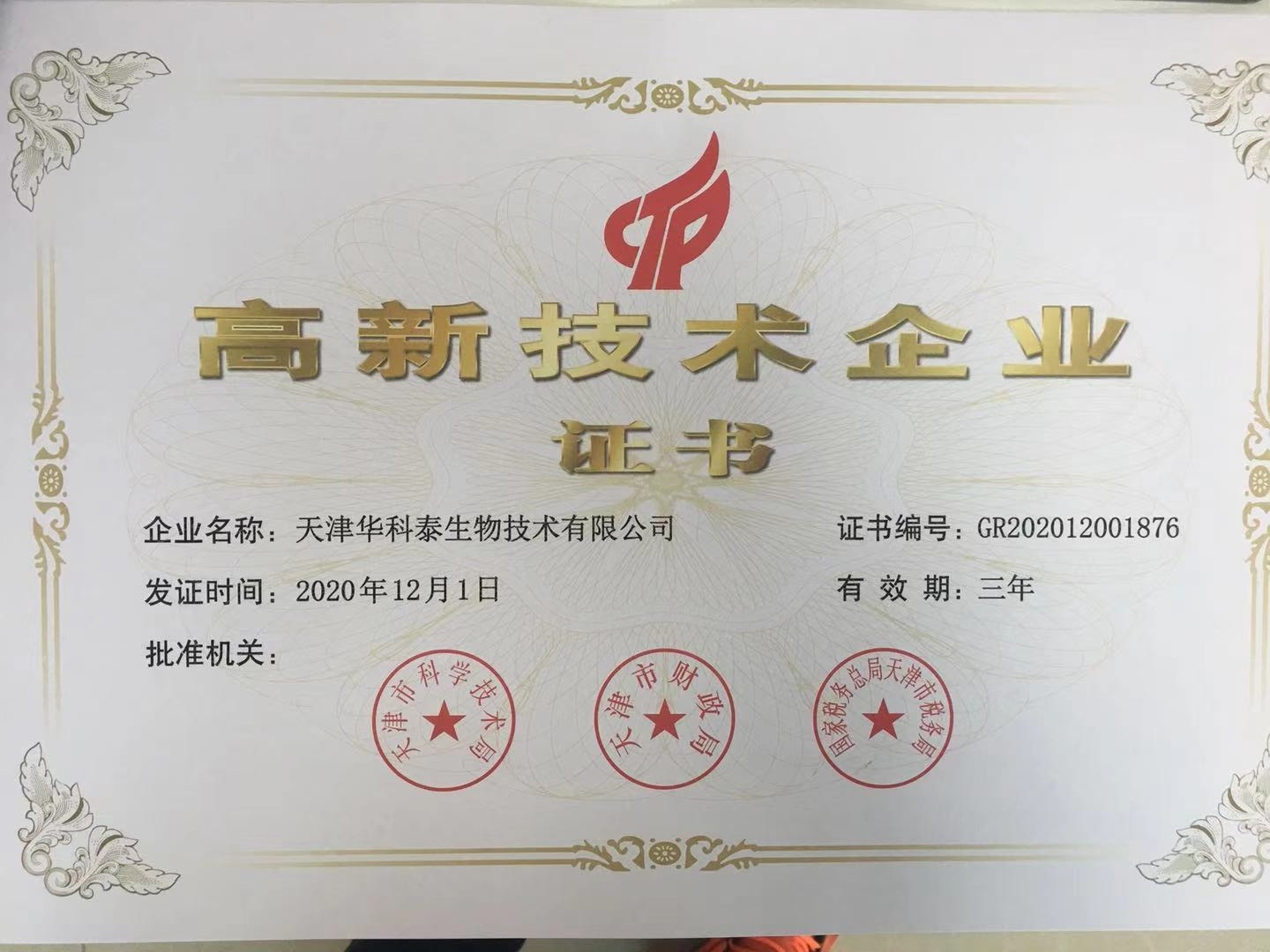 高新技术企业证书